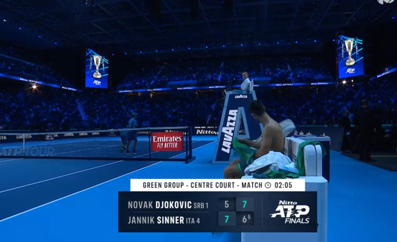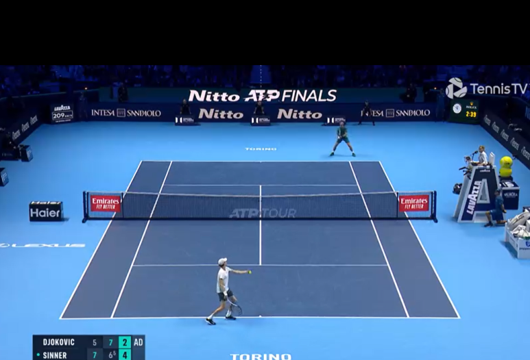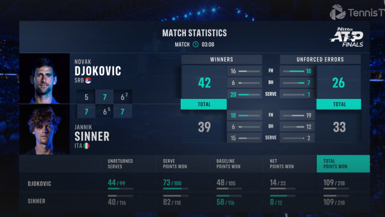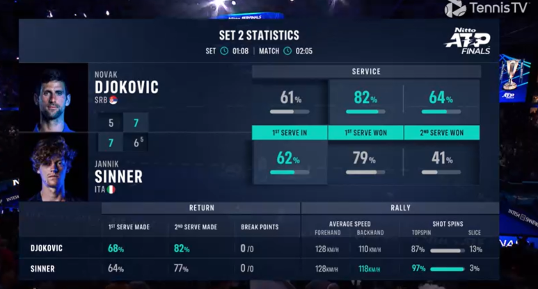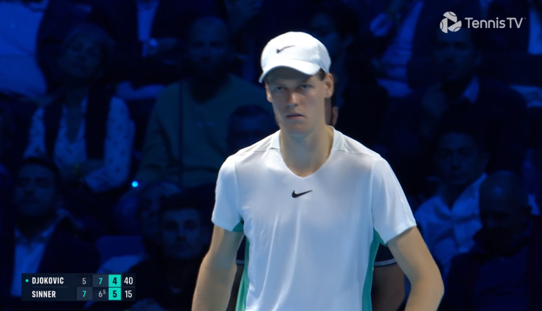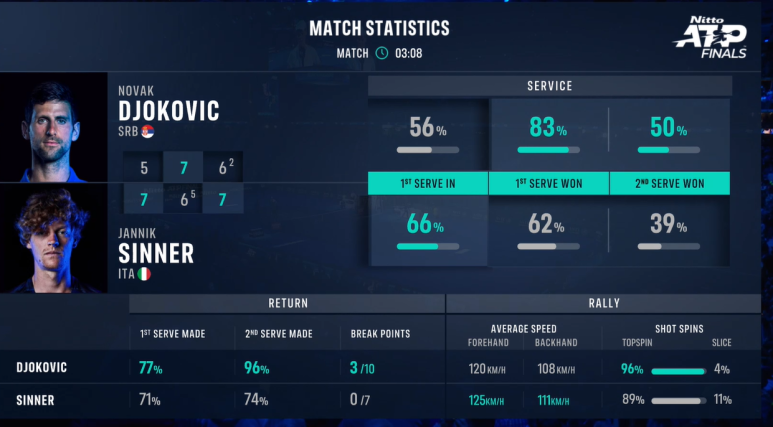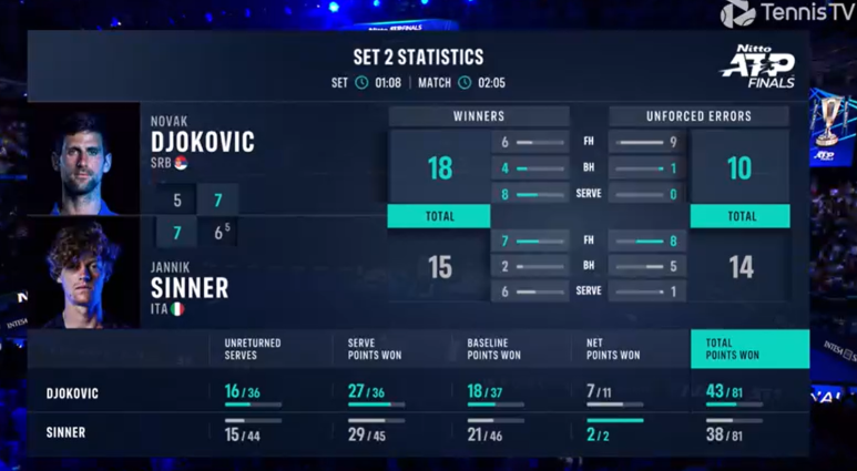 매치동안 조코비치가 20개 에이스, 시너는 15개 에이스... 에이스로 5-5까지 추격