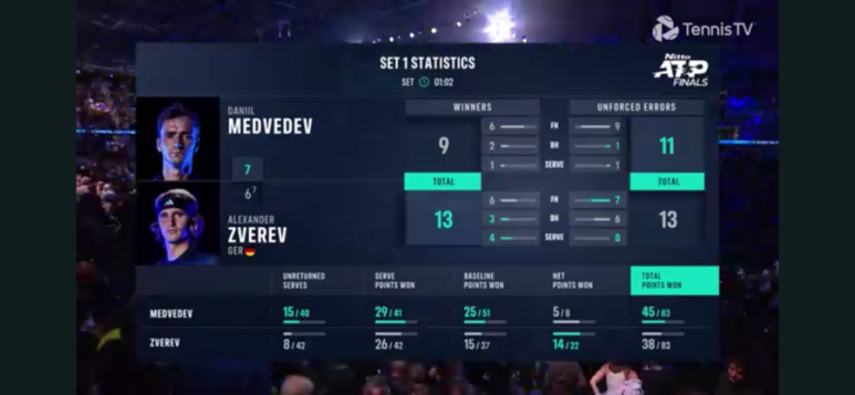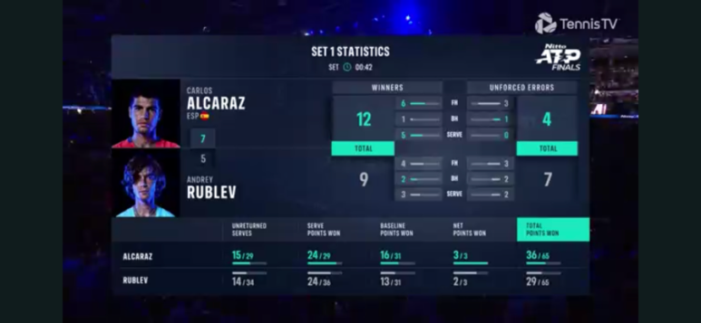 지난 경기에 비해 알카라스 언포슫에러가 많이 줄어들었다. 위너도 많고, 안정적인 1세트를 보여줬다.