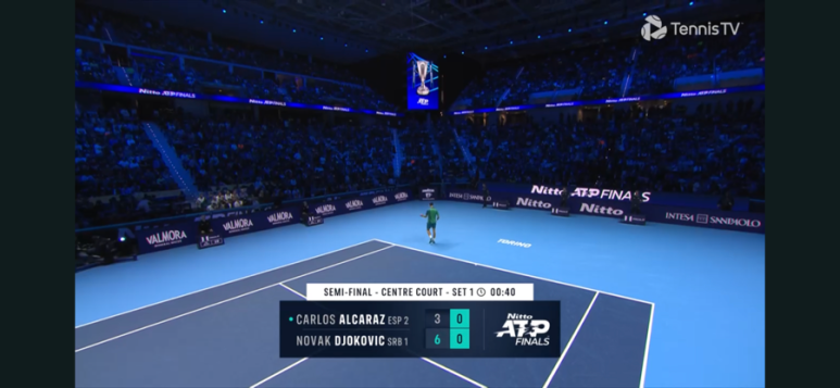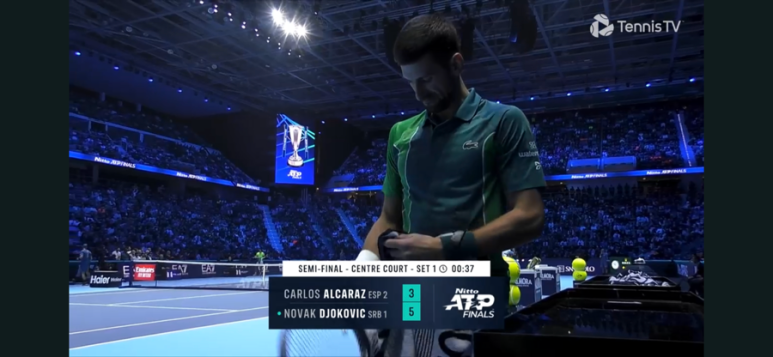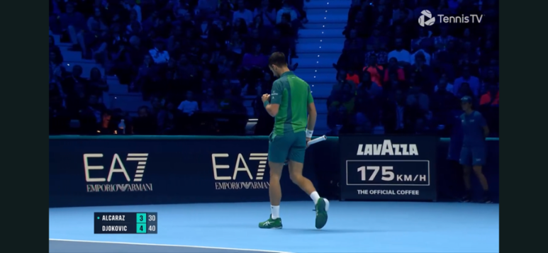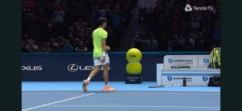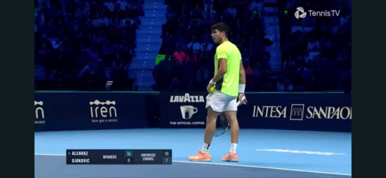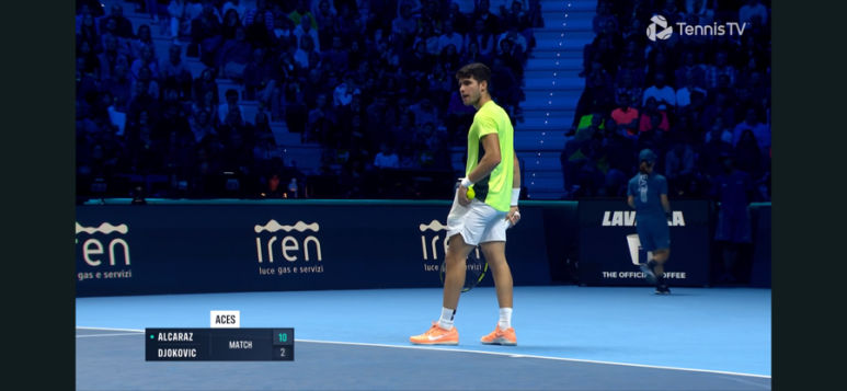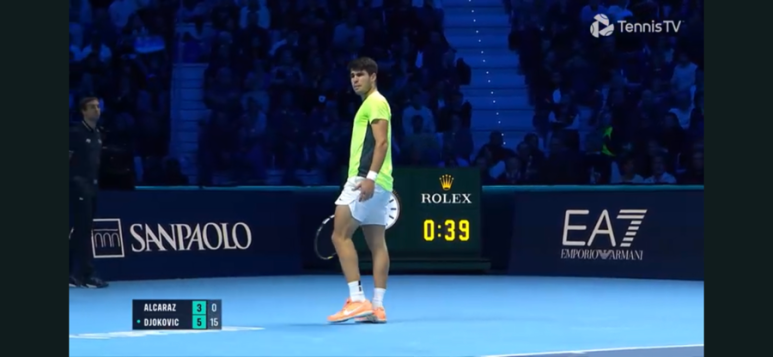 브레이크에 성공하고 만다. 오늘따라 유독 알카라스 발리가 잘 안들어가고, 실수 연발…